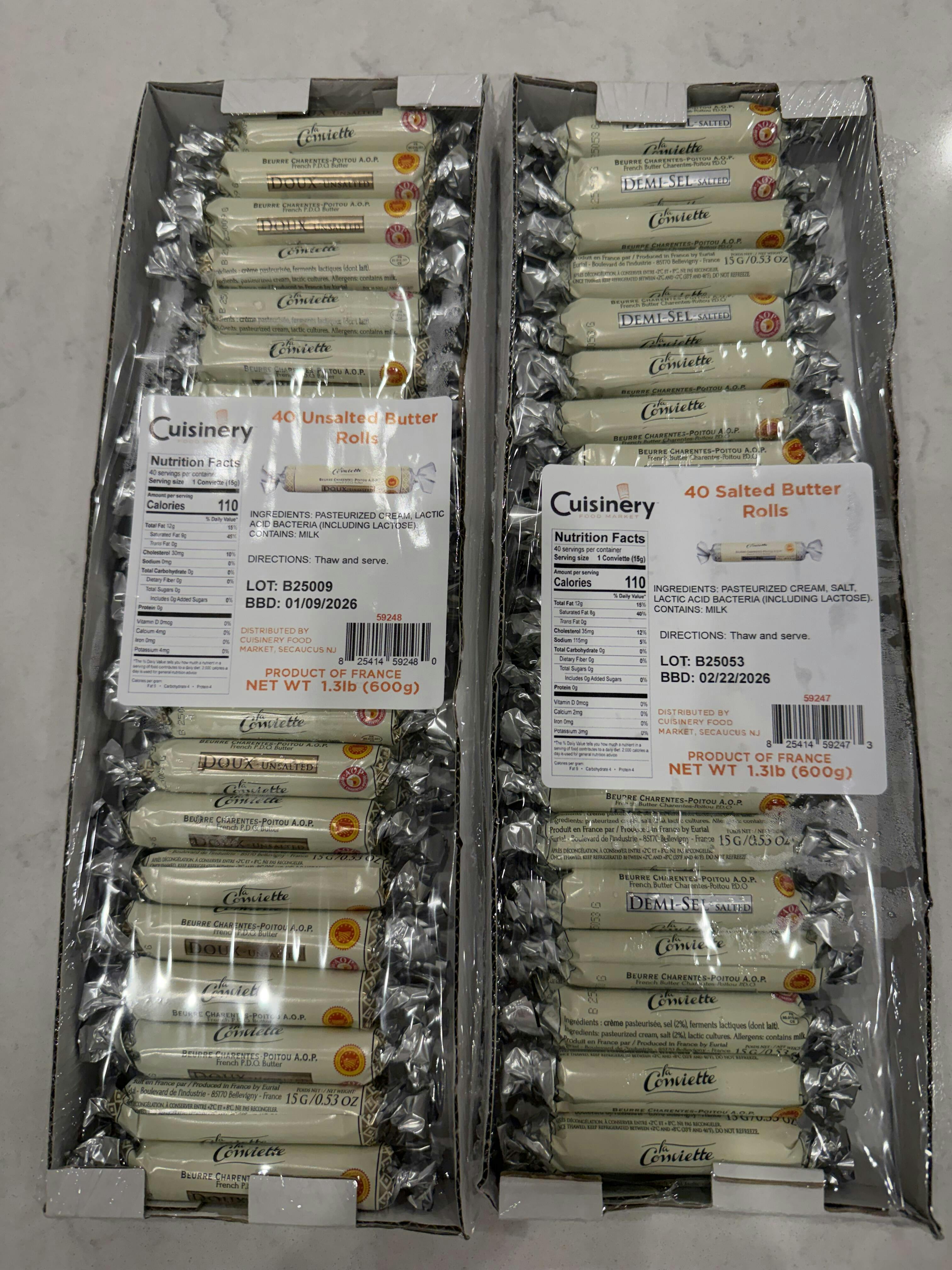 40 Premium salted French butter from La Conviette, made from pasteurized creams matured for at least 18 hours before setting into a fresh and flavorful spread. Always wrapped “bonbon” style, ideal for charming table settings and for everyday use.